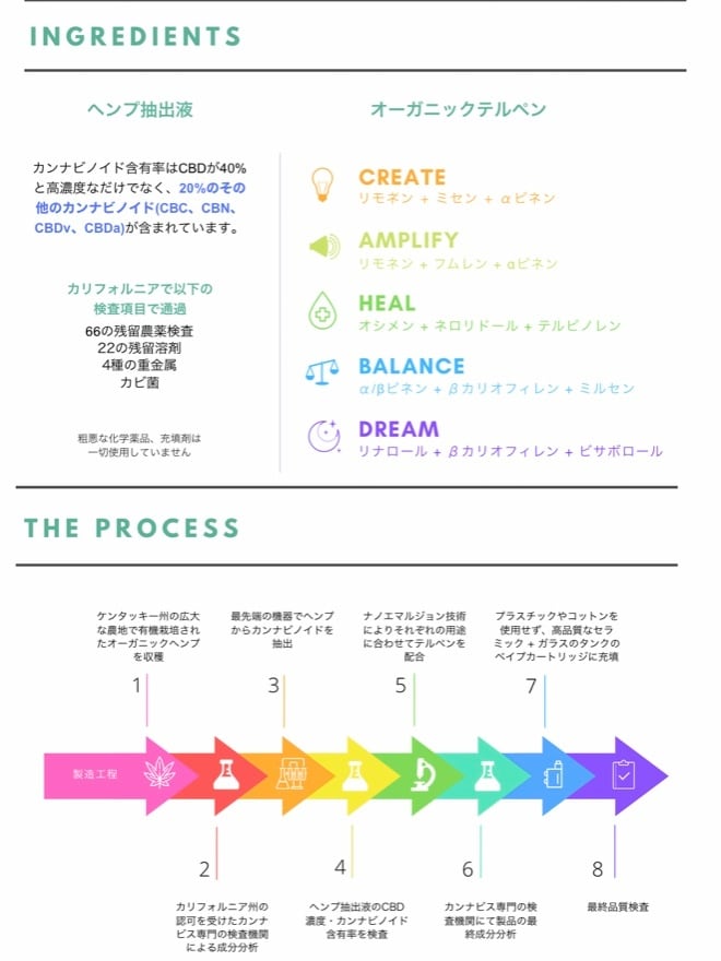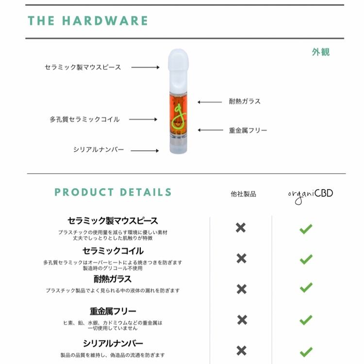 CBD含有率40%の高濃度カートリッジ。カンナビノイド含有率は60%とCBDカートリッジ製品の中では非常に高く、アントラージュ効果が期待できます。